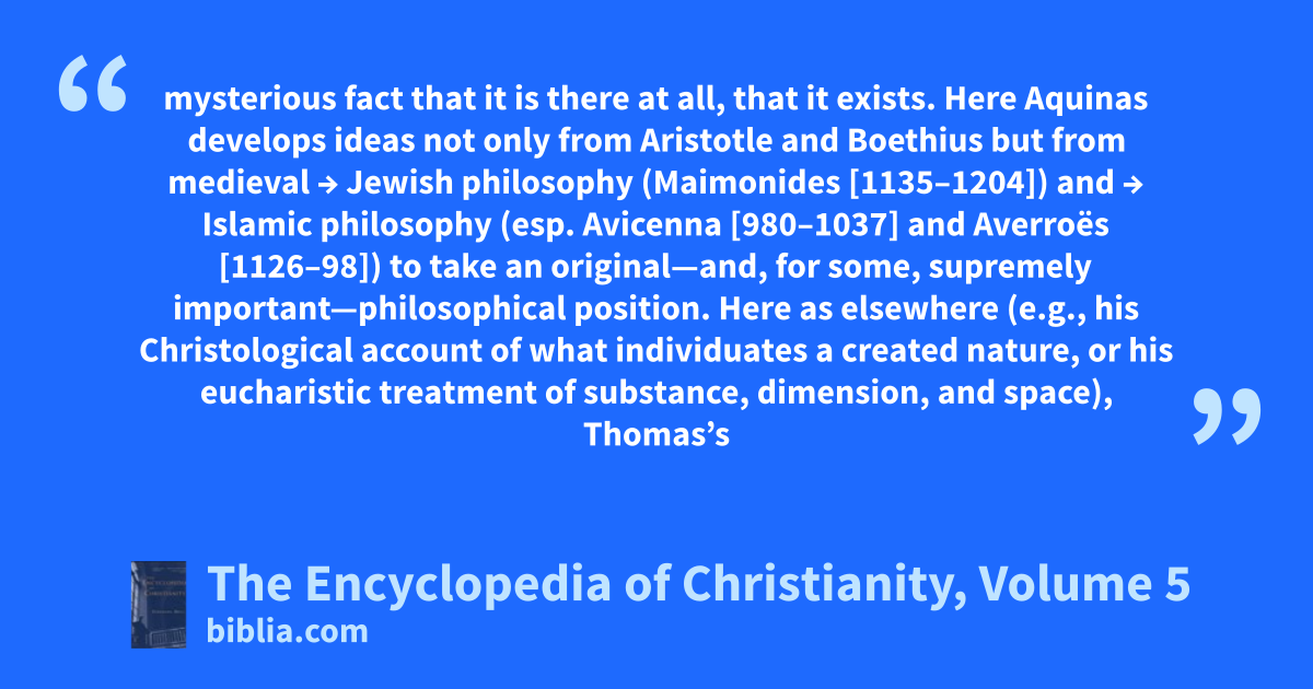 mysterious fact that it is there at all, that it exists. Here Aquinas develops ideas not only from Aristotle and Boethius but from medieval → Jewish philosophy (Maimonides [1135–1204]) and → Islamic philosophy (esp. Avicenna [980–1037] and Averroës [1126–98]) to take an original—and, for some, supremely important—philosophical position. Here as elsewhere (e.g., his Christological account of what individuates a created nature, or his eucharistic treatment of substance, dimension, and space), Thomas’s