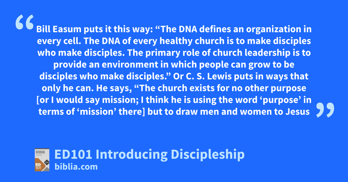 Bill Easum puts it this way: “The DNA defines an organization in every cell. The DNA of every healthy church is to make disciples who make disciples. The primary role of church leadership is to provide an environment in which people can grow to be disciples who make disciples.” Or C. S. Lewis puts in ways that only he can. He says, “The church exists for no other purpose [or I would say mission; I think he is using the word ‘purpose’ in terms of ‘mission’ there] but to draw men and women to Jesus