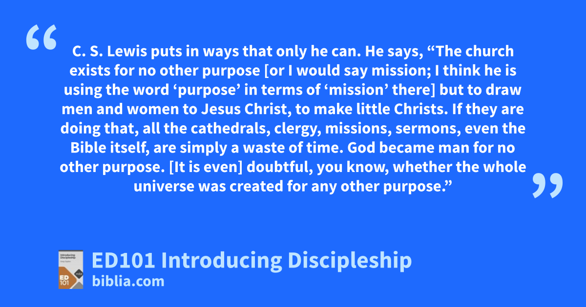 C. S. Lewis puts in ways that only he can. He says, “The church exists for no other purpose [or I would say mission; I think he is using the word ‘purpose’ in terms of ‘mission’ there] but to draw men and women to Jesus Christ, to make little Christs. If they are doing that, all the cathedrals, clergy, missions, sermons, even the Bible itself, are simply a waste of time. God became man for no other purpose. [It is even] doubtful, you know, whether the whole universe was created for any other purpose.”