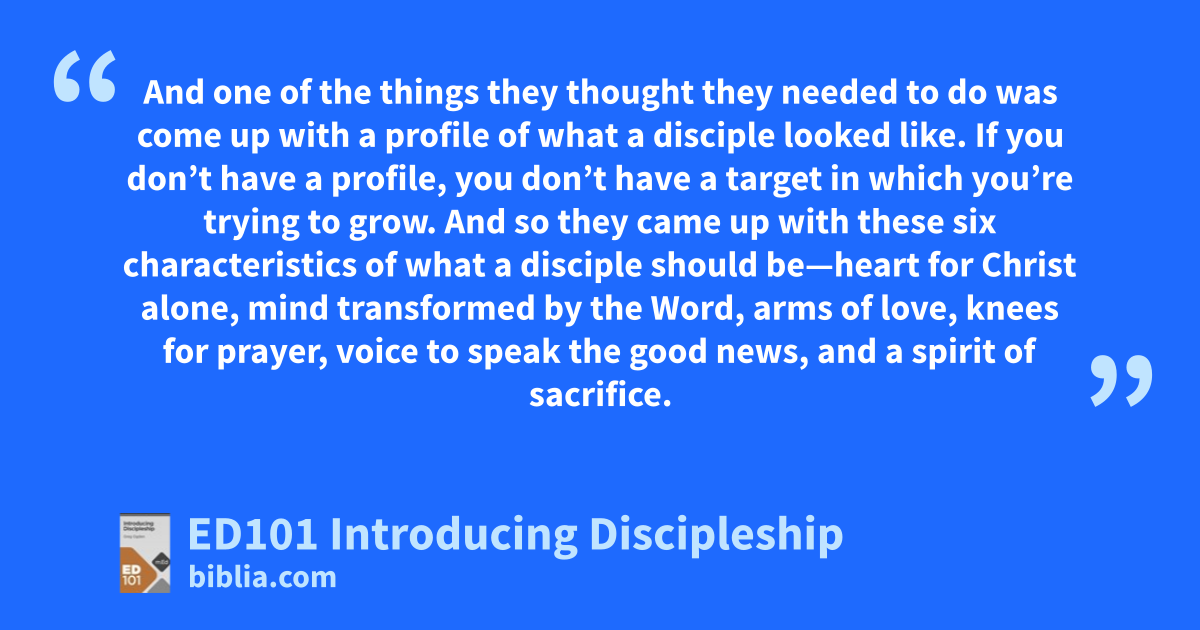 And one of the things they thought they needed to do was come up with a profile of what a disciple looked like. If you don’t have a profile, you don’t have a target in which you’re trying to grow. And so they came up with these six characteristics of what a disciple should be—heart for Christ alone, mind transformed by the Word, arms of love, knees for prayer, voice to speak the good news, and a spirit of sacrifice.