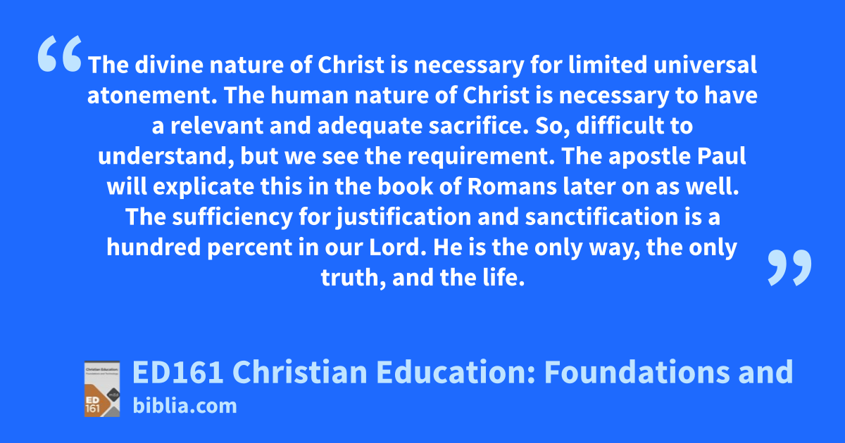 The divine nature of Christ is necessary for limited universal atonement. The human nature of Christ is necessary to have a relevant and adequate sacrifice. So, difficult to understand, but we see the requirement. The apostle Paul will explicate this in the book of Romans later on as well. The sufficiency for justification and sanctification is a hundred percent in our Lord. He is the only way, the only truth, and the life.