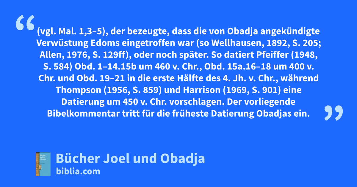 (vgl. Mal. 1,3–5), der bezeugte, dass die von Obadja angekündigte Verwüstung Edoms eingetroffen war (so Wellhausen, 1892, S. 205; Allen, 1976, S. 129ff), oder noch später. So datiert Pfeiffer (1948, S. 584) Obd. 1–14.15b um 460 v. Chr., Obd. 15a.16–18 um 400 v. Chr. und Obd. 19–21 in die erste Hälfte des 4. Jh. v. Chr., während Thompson (1956, S. 859) und Harrison (1969, S. 901) eine Datierung um 450 v. Chr. vorschlagen. Der vorliegende Bibelkommentar tritt für die früheste Datierung Obadjas ein.