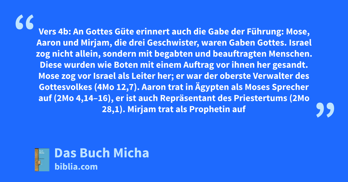 Vers 4b: An Gottes Güte erinnert auch die Gabe der Führung: Mose, Aaron und Mirjam, die drei Geschwister, waren Gaben Gottes. Israel zog nicht allein, sondern mit begabten und beauftragten Menschen. Diese wurden wie Boten mit einem Auftrag vor ihnen her gesandt. Mose zog vor Israel als Leiter her; er war der oberste Verwalter des Gottesvolkes (4Mo 12,7). Aaron trat in Ägypten als Moses Sprecher auf (2Mo 4,14–16), er ist auch Repräsentant des Priestertums (2Mo 28,1). Mirjam trat als Prophetin auf