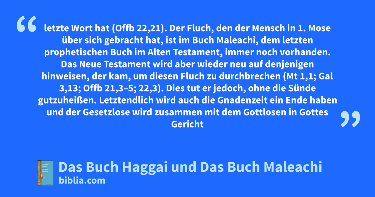 letzte Wort hat (Offb 22,21). Der Fluch, den der Mensch in 1. Mose über sich gebracht hat, ist im Buch Maleachi, dem letzten prophetischen Buch im Alten Testament, immer noch vorhanden. Das Neue Testament wird aber wieder neu auf denjenigen hinweisen, der kam, um diesen Fluch zu durchbrechen (Mt 1,1; Gal 3,13; Offb 21,3–5; 22,3). Dies tut er jedoch, ohne die Sünde gutzuheißen. Letztendlich wird auch die Gnadenzeit ein Ende haben und der Gesetzlose wird zusammen mit dem Gottlosen in Gottes Gericht