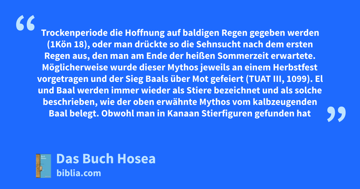 Trockenperiode die Hoffnung auf baldigen Regen gegeben werden (1Kön 18), oder man drückte so die Sehnsucht nach dem ersten Regen aus, den man am Ende der heißen Sommerzeit erwartete. Möglicherweise wurde dieser Mythos jeweils an einem Herbstfest vorgetragen und der Sieg Baals über Mot gefeiert (TUAT III, 1099). El und Baal werden immer wieder als Stiere bezeichnet und als solche beschrieben, wie der oben erwähnte Mythos vom kalbzeugenden Baal belegt. Obwohl man in Kanaan Stierfiguren gefunden hat