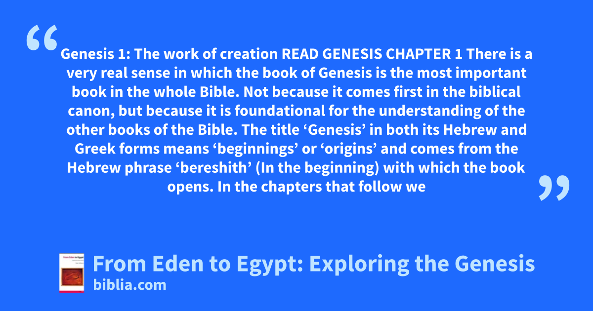 Genesis 1: The work of creation READ GENESIS CHAPTER 1 There is a very real sense in which the book of Genesis is the most important book in the whole Bible. Not because it comes first in the biblical canon, but because it is foundational for the understanding of the other books of the Bible. The title ‘Genesis’ in both its Hebrew and Greek forms means ‘beginnings’ or ‘origins’ and comes from the Hebrew phrase ‘bereshith’ (In the beginning) with which the book opens. In the chapters that follow we