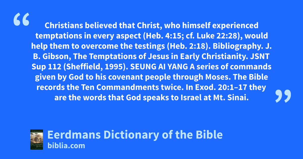 Christians believed that Christ, who himself experienced temptations in every aspect (Heb. 4:15; cf. Luke 22:28), would help them to overcome the testings (Heb. 2:18). Bibliography. J. B. Gibson, The Temptations of Jesus in Early Christianity. JSNT Sup 112 (Sheffield, 1995). SEUNG AI YANG A series of commands given by God to his covenant people through Moses. The Bible records the Ten Commandments twice. In Exod. 20:1–17 they are the words that God speaks to Israel at Mt. Sinai.