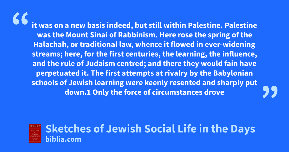 it was on a new basis indeed, but still within Palestine. Palestine was the Mount Sinai of Rabbinism. Here rose the spring of the Halachah, or traditional law, whence it flowed in ever-widening streams; here, for the first centuries, the learning, the influence, and the rule of Judaism centred; and there they would fain have perpetuated it. The first attempts at rivalry by the Babylonian schools of Jewish learning were keenly resented and sharply put down.1 Only the force of circumstances drove
