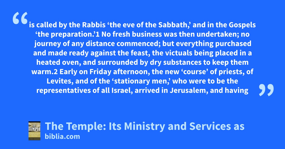 is called by the Rabbis ‘the eve of the Sabbath,’ and in the Gospels ‘the preparation.’1 No fresh business was then undertaken; no journey of any distance commenced; but everything purchased and made ready against the feast, the victuals being placed in a heated oven, and surrounded by dry substances to keep them warm.2 Early on Friday afternoon, the new ‘course’ of priests, of Levites, and of the ‘stationary men,’ who were to be the representatives of all Israel, arrived in Jerusalem, and having