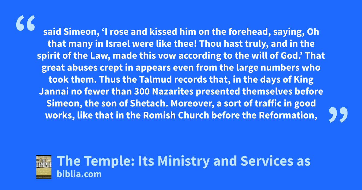 said Simeon, ‘I rose and kissed him on the forehead, saying, Oh that many in Israel were like thee! Thou hast truly, and in the spirit of the Law, made this vow according to the will of God.’ That great abuses crept in appears even from the large numbers who took them. Thus the Talmud records that, in the days of King Jannai no fewer than 300 Nazarites presented themselves before Simeon, the son of Shetach. Moreover, a sort of traffic in good works, like that in the Romish Church before the Reformation,
