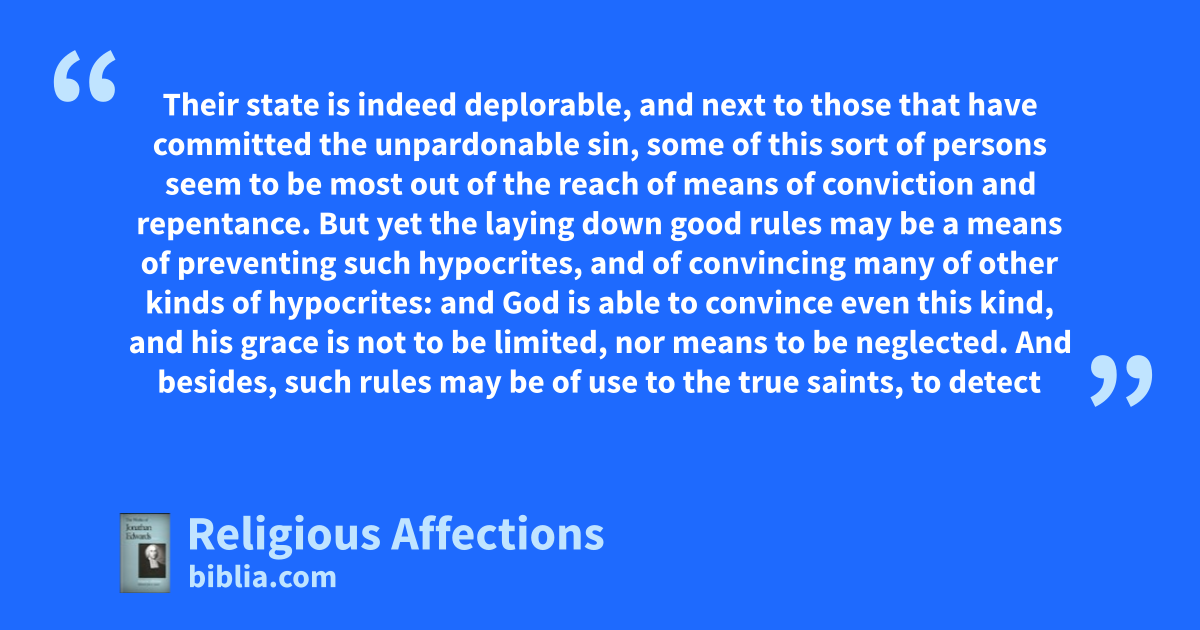 Their state is indeed deplorable, and next to those that have committed the unpardonable sin, some of this sort of persons seem to be most out of the reach of means of conviction and repentance. But yet the laying down good rules may be a means of preventing such hypocrites, and of convincing many of other kinds of hypocrites: and God is able to convince even this kind, and his grace is not to be limited, nor means to be neglected. And besides, such rules may be of use to the true saints, to detect
