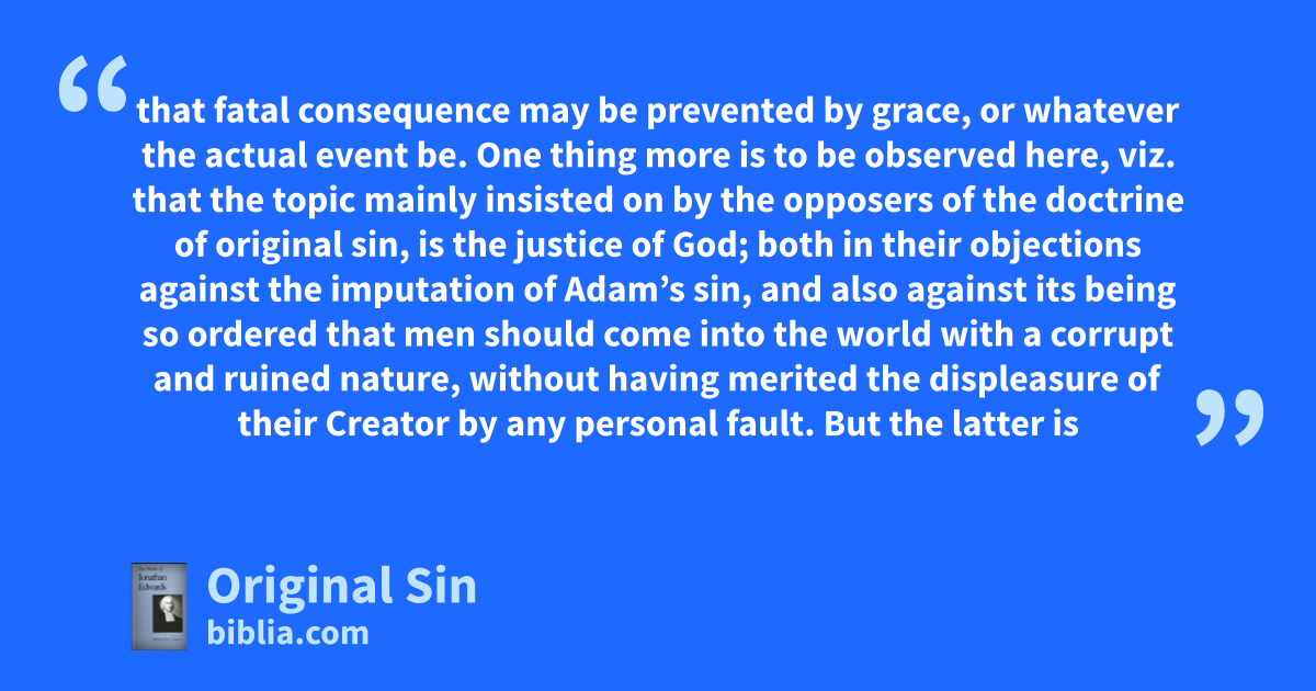 that fatal consequence may be prevented by grace, or whatever the actual event be. One thing more is to be observed here, viz. that the topic mainly insisted on by the opposers of the doctrine of original sin, is the justice of God; both in their objections against the imputation of Adam’s sin, and also against its being so ordered that men should come into the world with a corrupt and ruined nature, without having merited the displeasure of their Creator by any personal fault. But the latter is