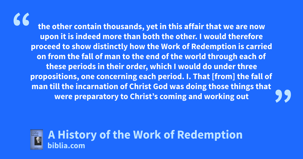 the other contain thousands, yet in this affair that we are now upon it is indeed more than both the other. I would therefore proceed to show distinctly how the Work of Redemption is carried on from the fall of man to the end of the world through each of these periods in their order, which I would do under three propositions, one concerning each period. I. That [from] the fall of man till the incarnation of Christ God was doing those things that were preparatory to Christ’s coming and working out