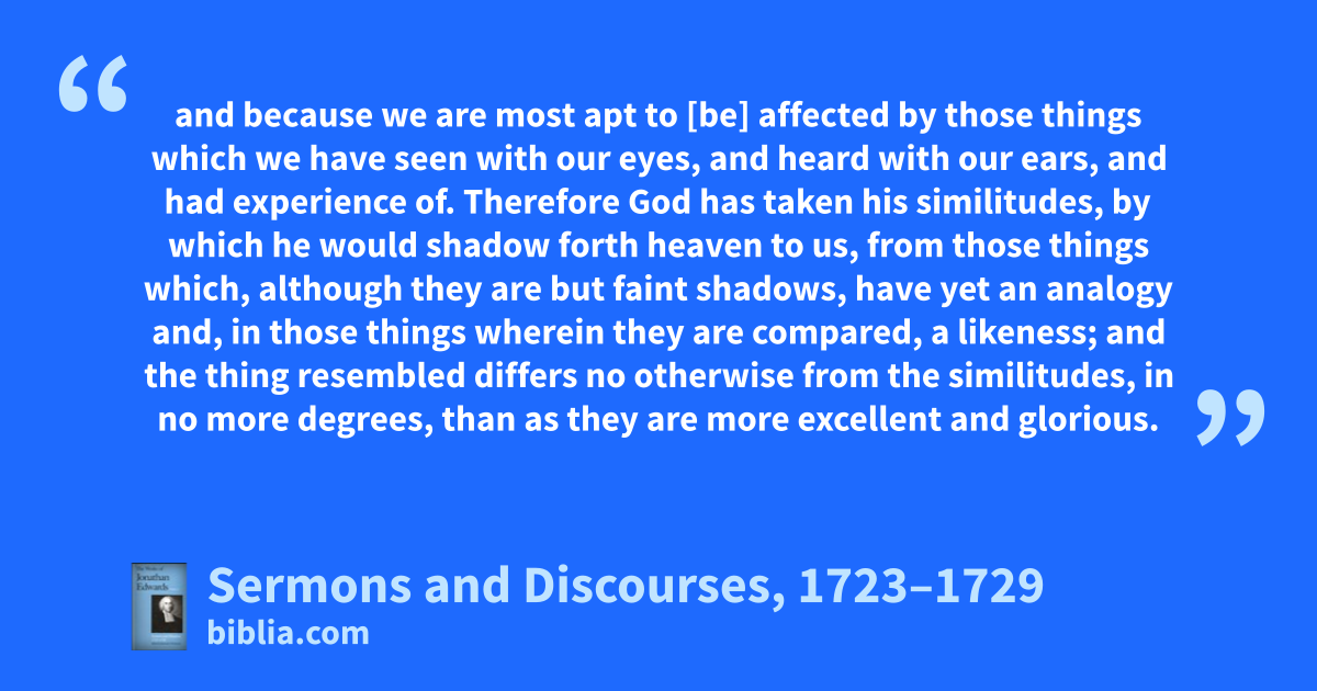 and because we are most apt to [be] affected by those things which we have seen with our eyes, and heard with our ears, and had experience of. Therefore God has taken his similitudes, by which he would shadow forth heaven to us, from those things which, although they are but faint shadows, have yet an analogy and, in those things wherein they are compared, a likeness; and the thing resembled differs no otherwise from the similitudes, in no more degrees, than as they are more excellent and glorious.