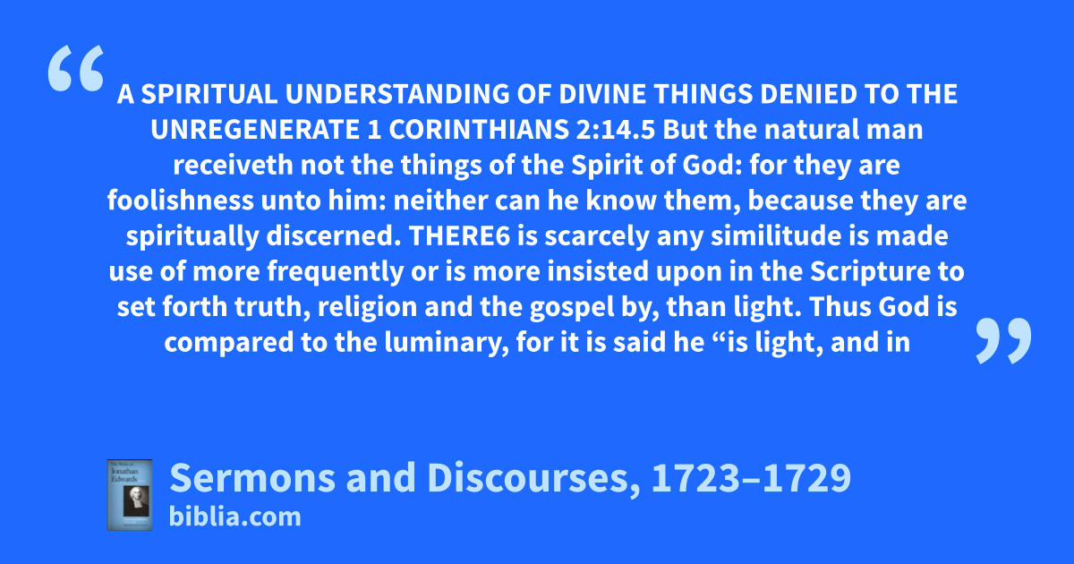 A SPIRITUAL UNDERSTANDING OF DIVINE THINGS DENIED TO THE UNREGENERATE 1 CORINTHIANS 2:14.5 But the natural man receiveth not the things of the Spirit of God: for they are foolishness unto him: neither can he know them, because they are spiritually discerned. THERE6 is scarcely any similitude is made use of more frequently or is more insisted upon in the Scripture to set forth truth, religion and the gospel by, than light. Thus God is compared to the luminary, for it is said he “is light, and in