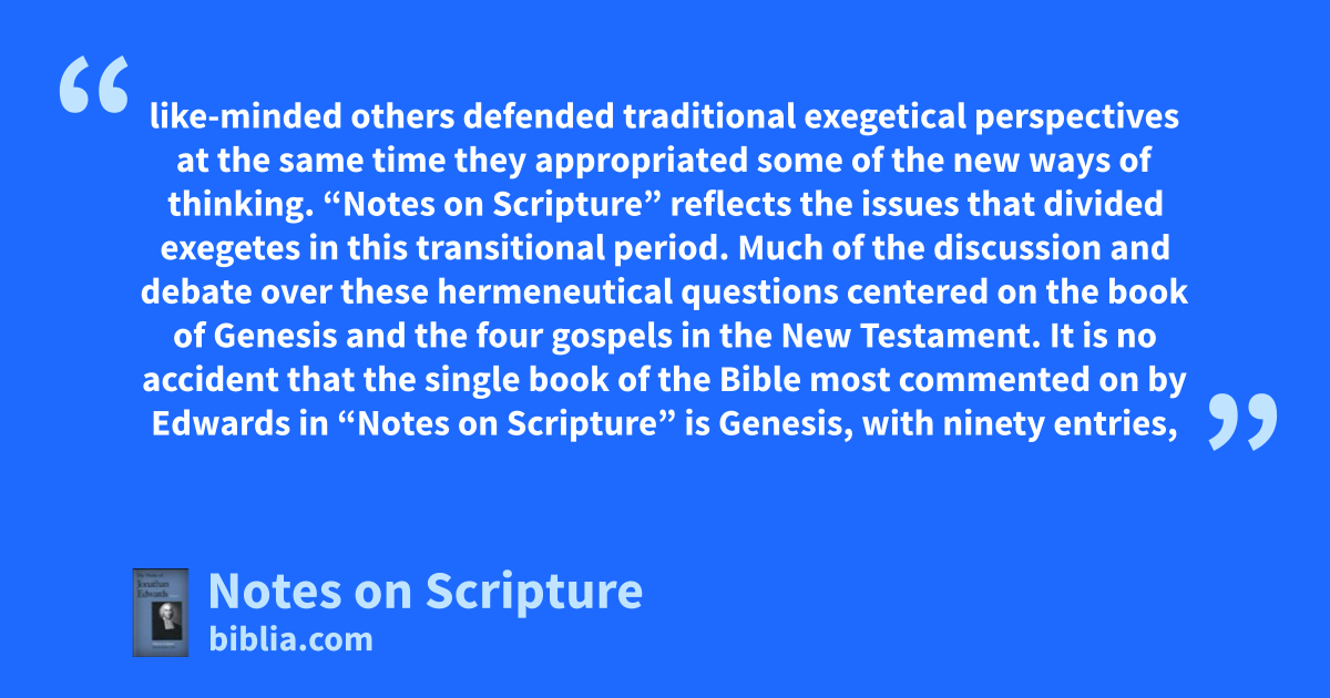 like-minded others defended traditional exegetical perspectives at the same time they appropriated some of the new ways of thinking. “Notes on Scripture” reflects the issues that divided exegetes in this transitional period. Much of the discussion and debate over these hermeneutical questions centered on the book of Genesis and the four gospels in the New Testament. It is no accident that the single book of the Bible most commented on by Edwards in “Notes on Scripture” is Genesis, with ninety entries,