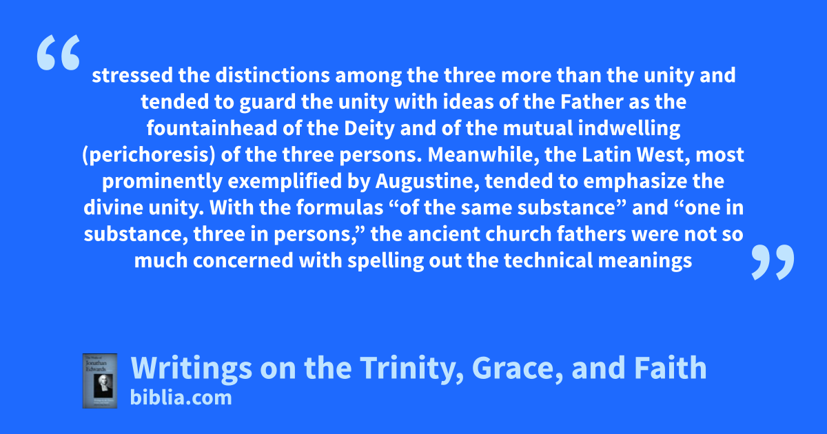 stressed the distinctions among the three more than the unity and tended to guard the unity with ideas of the Father as the fountainhead of the Deity and of the mutual indwelling (perichoresis) of the three persons. Meanwhile, the Latin West, most prominently exemplified by Augustine, tended to emphasize the divine unity. With the formulas “of the same substance” and “one in substance, three in persons,” the ancient church fathers were not so much concerned with spelling out the technical meanings