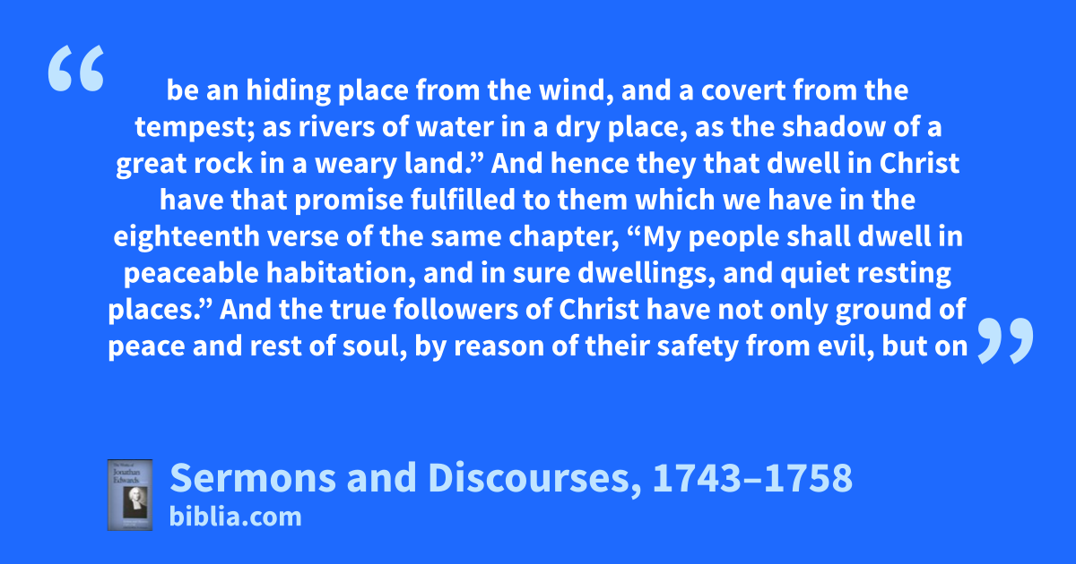 be an hiding place from the wind, and a covert from the tempest; as rivers of water in a dry place, as the shadow of a great rock in a weary land.” And hence they that dwell in Christ have that promise fulfilled to them which we have in the eighteenth verse of the same chapter, “My people shall dwell in peaceable habitation, and in sure dwellings, and quiet resting places.” And the true followers of Christ have not only ground of peace and rest of soul, by reason of their safety from evil, but on