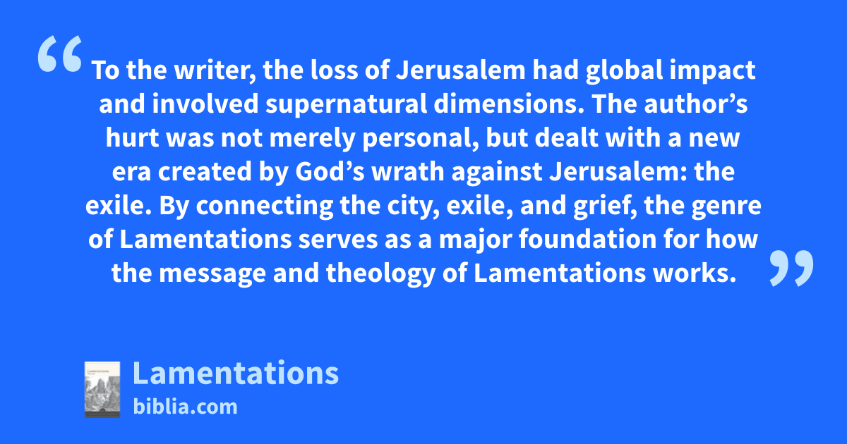 To the writer, the loss of Jerusalem had global impact and involved supernatural dimensions. The author’s hurt was not merely personal, but dealt with a new era created by God’s wrath against Jerusalem: the exile. By connecting the city, exile, and grief, the genre of Lamentations serves as a major foundation for how the message and theology of Lamentations works.