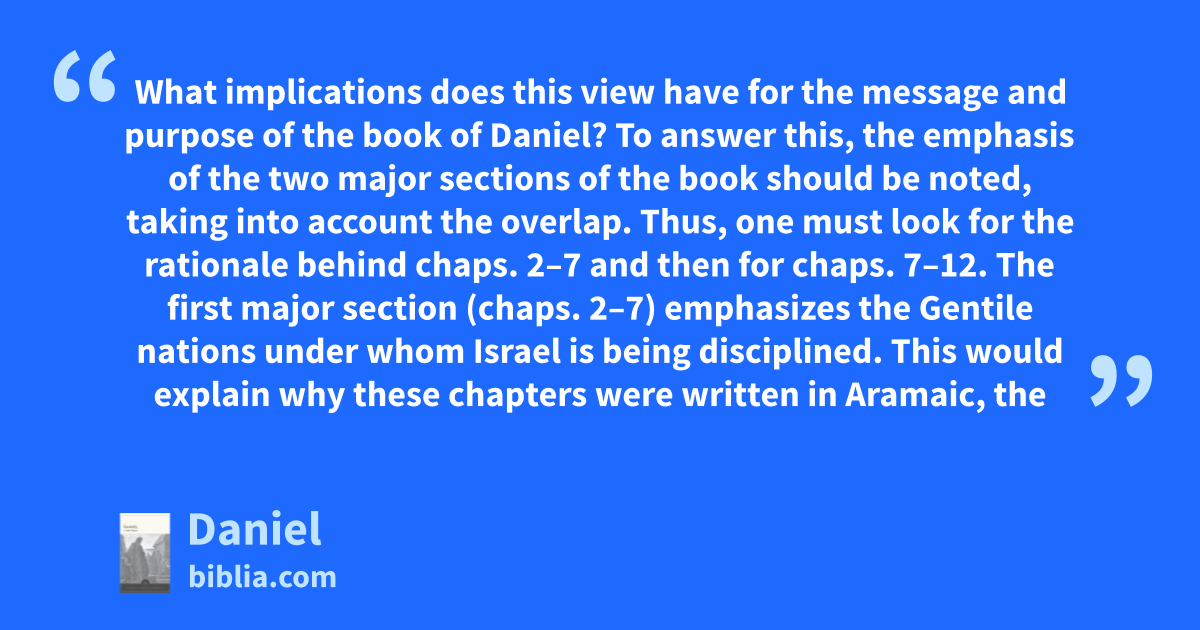 What implications does this view have for the message and purpose of the book of Daniel? To answer this, the emphasis of the two major sections of the book should be noted, taking into account the overlap. Thus, one must look for the rationale behind chaps. 2–7 and then for chaps. 7–12. The first major section (chaps. 2–7) emphasizes the Gentile nations under whom Israel is being disciplined. This would explain why these chapters were written in Aramaic, the