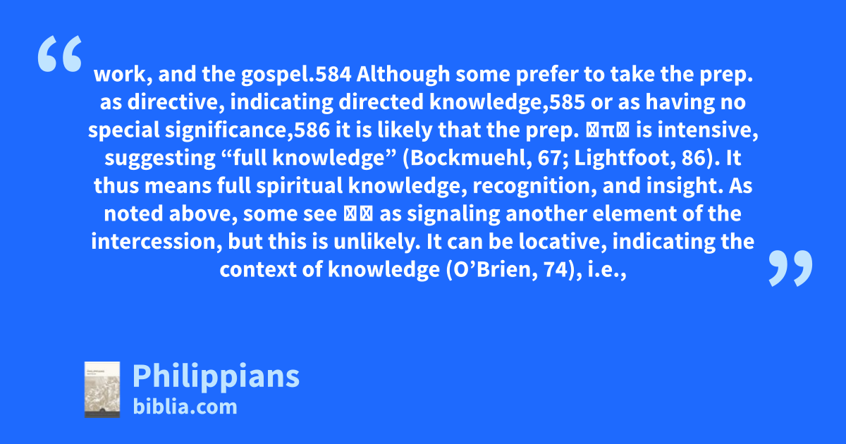 work, and the gospel.584 Although some prefer to take the prep. as directive, indicating directed knowledge,585 or as having no special significance,586 it is likely that the prep. ἐπί is intensive, suggesting “full knowledge” (Bockmuehl, 67; Lightfoot, 86). It thus means full spiritual knowledge, recognition, and insight. As noted above, some see ἐν as signaling another element of the intercession, but this is unlikely. It can be locative, indicating the context of knowledge (O’Brien, 74), i.e.,