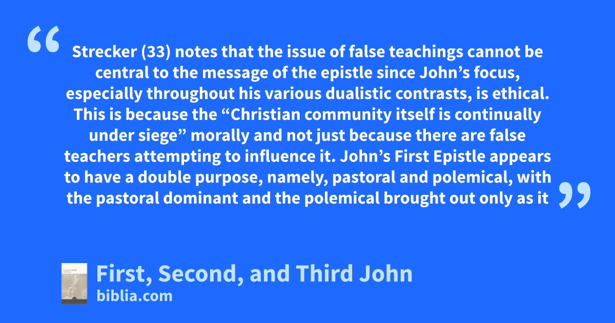 Strecker (33) notes that the issue of false teachings cannot be central to the message of the epistle since John’s focus, especially throughout his various dualistic contrasts, is ethical. This is because the “Christian community itself is continually under siege” morally and not just because there are false teachers attempting to influence it. John’s First Epistle appears to have a double purpose, namely, pastoral and polemical, with the pastoral dominant and the polemical brought out only as it