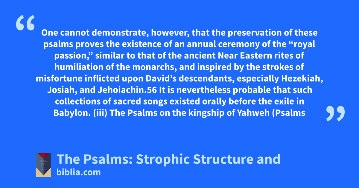 One cannot demonstrate, however, that the preservation of these psalms proves the existence of an annual ceremony of the “royal passion,” similar to that of the ancient Near Eastern rites of humiliation of the monarchs, and inspired by the strokes of misfortune inflicted upon David’s descendants, especially Hezekiah, Josiah, and Jehoiachin.56 It is nevertheless probable that such collections of sacred songs existed orally before the exile in Babylon. (iii) The Psalms on the kingship of Yahweh (Psalms