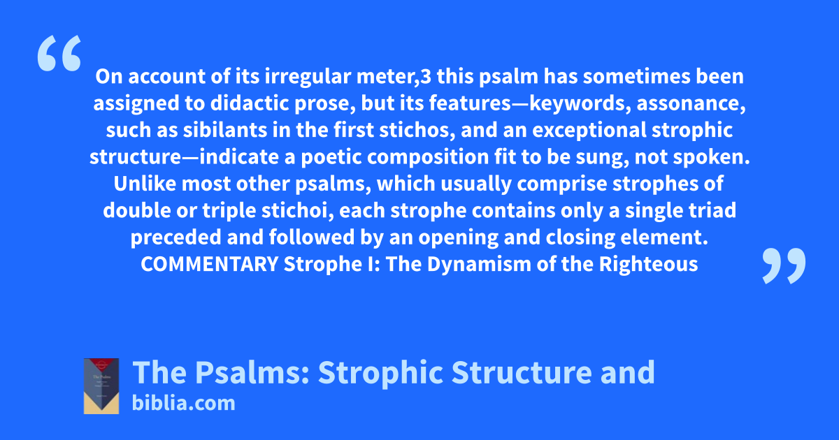 On account of its irregular meter,3 this psalm has sometimes been assigned to didactic prose, but its features—keywords, assonance, such as sibilants in the first stichos, and an exceptional strophic structure—indicate a poetic composition fit to be sung, not spoken. Unlike most other psalms, which usually comprise strophes of double or triple stichoi, each strophe contains only a single triad preceded and followed by an opening and closing element. COMMENTARY Strophe I: The Dynamism of the Righteous