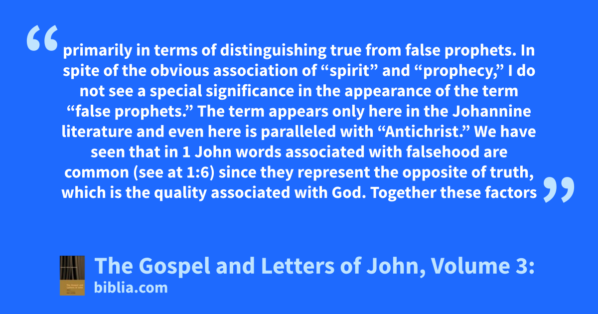 primarily in terms of distinguishing true from false prophets. In spite of the obvious association of “spirit” and “prophecy,” I do not see a special significance in the appearance of the term “false prophets.” The term appears only here in the Johannine literature and even here is paralleled with “Antichrist.” We have seen that in 1 John words associated with falsehood are common (see at 1:6) since they represent the opposite of truth, which is the quality associated with God. Together these factors