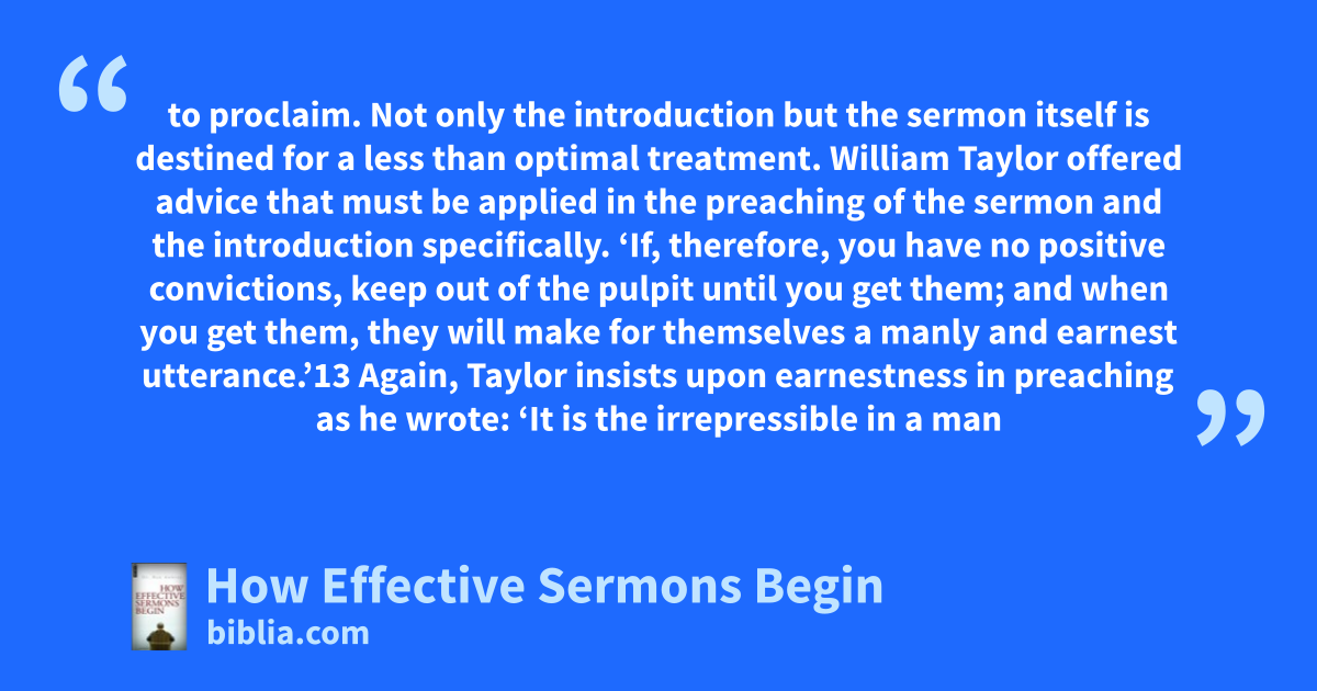 to proclaim. Not only the introduction but the sermon itself is destined for a less than optimal treatment. William Taylor offered advice that must be applied in the preaching of the sermon and the introduction specifically. ‘If, therefore, you have no positive convictions, keep out of the pulpit until you get them; and when you get them, they will make for themselves a manly and earnest utterance.’13 Again, Taylor insists upon earnestness in preaching as he wrote: ‘It is the irrepressible in a man