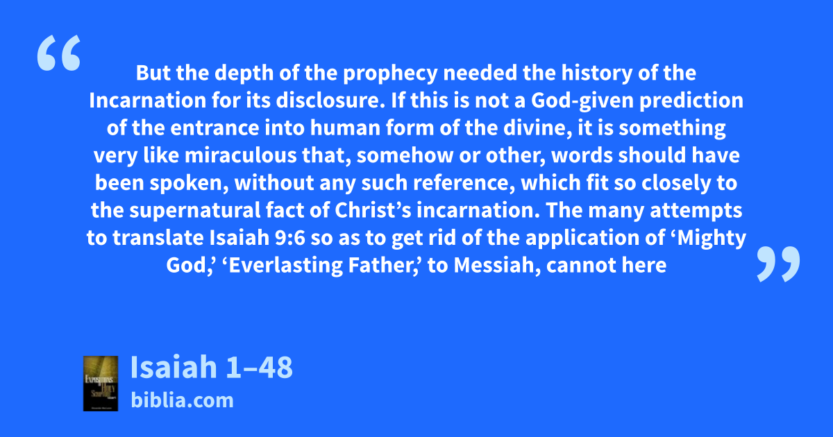 But the depth of the prophecy needed the history of the Incarnation for its disclosure. If this is not a God-given prediction of the entrance into human form of the divine, it is something very like miraculous that, somehow or other, words should have been spoken, without any such reference, which fit so closely to the supernatural fact of Christ’s incarnation. The many attempts to translate Isaiah 9:6 so as to get rid of the application of ‘Mighty God,’ ‘Everlasting Father,’ to Messiah, cannot here