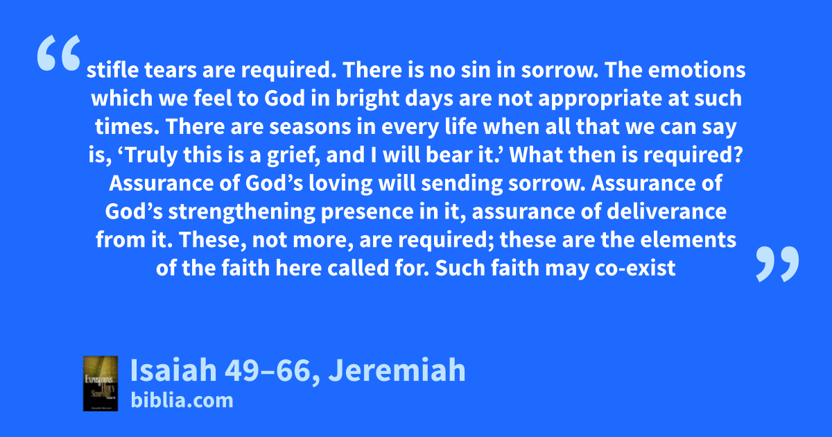 stifle tears are required. There is no sin in sorrow. The emotions which we feel to God in bright days are not appropriate at such times. There are seasons in every life when all that we can say is, ‘Truly this is a grief, and I will bear it.’ What then is required? Assurance of God’s loving will sending sorrow. Assurance of God’s strengthening presence in it, assurance of deliverance from it. These, not more, are required; these are the elements of the faith here called for. Such faith may co-exist