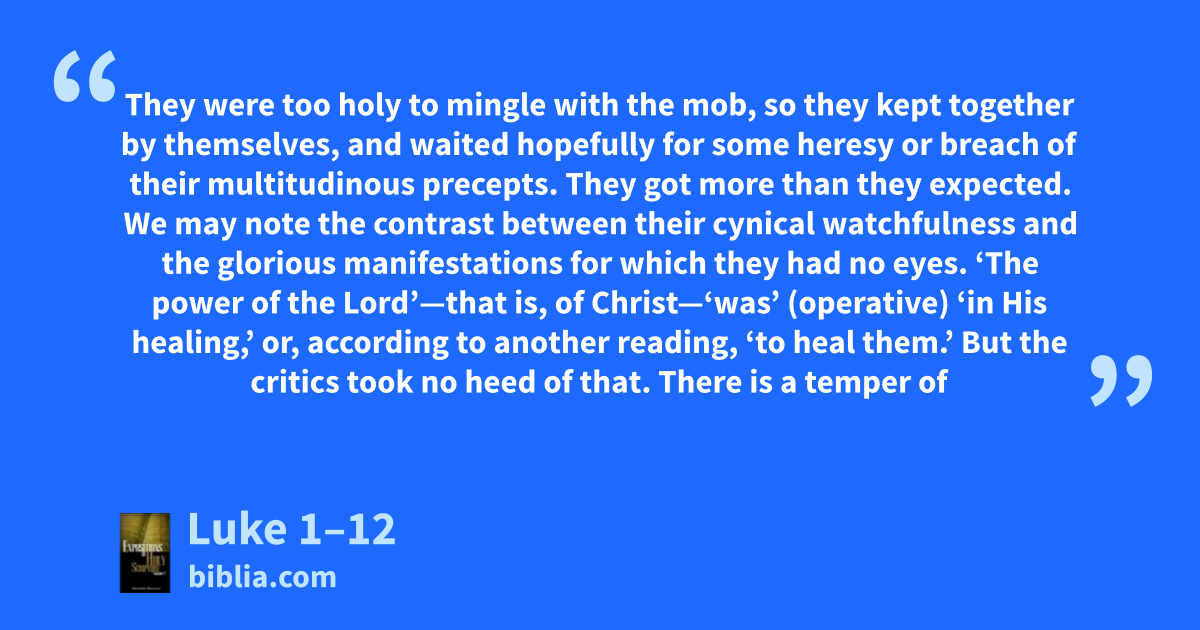 They were too holy to mingle with the mob, so they kept together by themselves, and waited hopefully for some heresy or breach of their multitudinous precepts. They got more than they expected. We may note the contrast between their cynical watchfulness and the glorious manifestations for which they had no eyes. ‘The power of the Lord’—that is, of Christ—‘was’ (operative) ‘in His healing,’ or, according to another reading, ‘to heal them.’ But the critics took no heed of that. There is a temper of