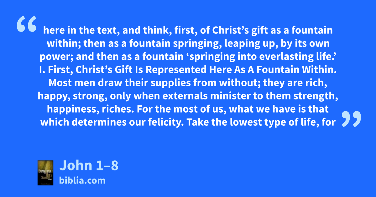 here in the text, and think, first, of Christ’s gift as a fountain within; then as a fountain springing, leaping up, by its own power; and then as a fountain ‘springing into everlasting life.’ I. First, Christ’s Gift Is Represented Here As A Fountain Within. Most men draw their supplies from without; they are rich, happy, strong, only when externals minister to them strength, happiness, riches. For the most of us, what we have is that which determines our felicity. Take the lowest type of life, for
