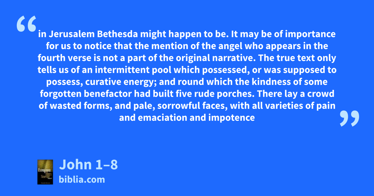 in Jerusalem Bethesda might happen to be. It may be of importance for us to notice that the mention of the angel who appears in the fourth verse is not a part of the original narrative. The true text only tells us of an intermittent pool which possessed, or was supposed to possess, curative energy; and round which the kindness of some forgotten benefactor had built five rude porches. There lay a crowd of wasted forms, and pale, sorrowful faces, with all varieties of pain and emaciation and impotence