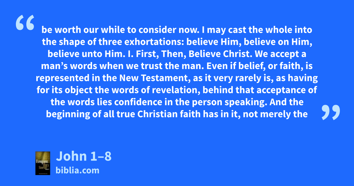 be worth our while to consider now. I may cast the whole into the shape of three exhortations: believe Him, believe on Him, believe unto Him. I. First, Then, Believe Christ. We accept a man’s words when we trust the man. Even if belief, or faith, is represented in the New Testament, as it very rarely is, as having for its object the words of revelation, behind that acceptance of the words lies confidence in the person speaking. And the beginning of all true Christian faith has in it, not merely the
