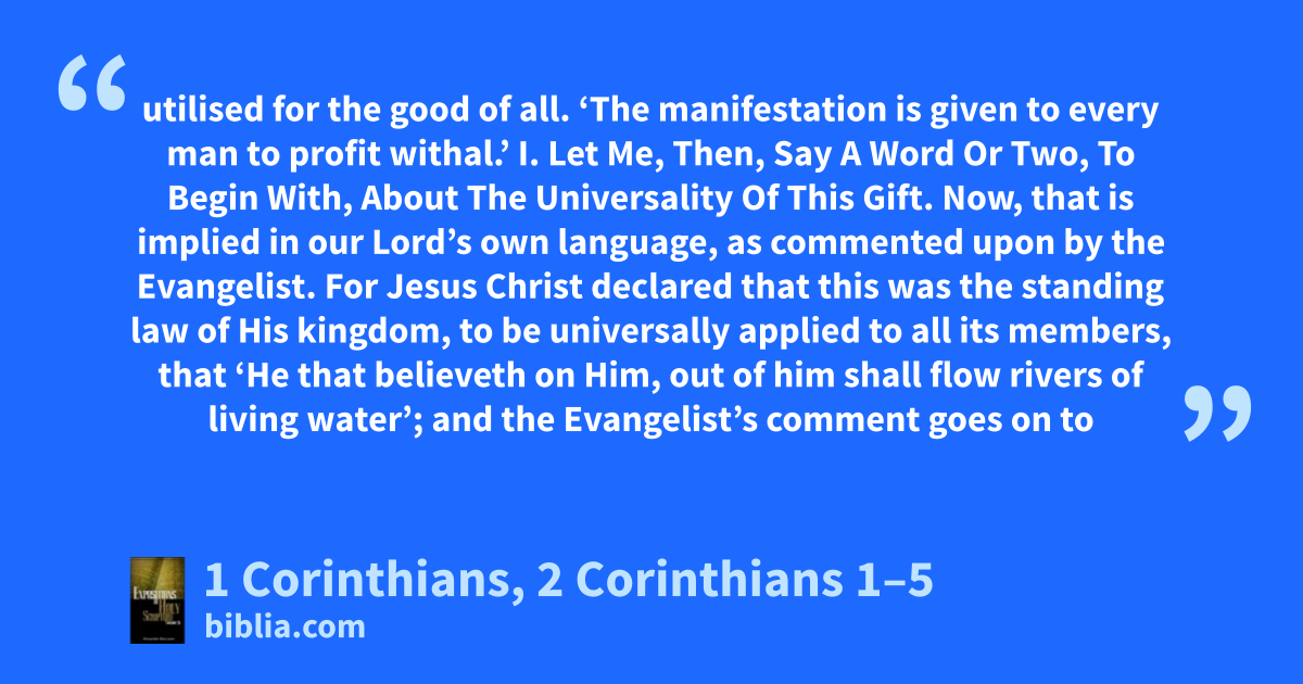 utilised for the good of all. ‘The manifestation is given to every man to profit withal.’ I. Let Me, Then, Say A Word Or Two, To Begin With, About The Universality Of This Gift. Now, that is implied in our Lord’s own language, as commented upon by the Evangelist. For Jesus Christ declared that this was the standing law of His kingdom, to be universally applied to all its members, that ‘He that believeth on Him, out of him shall flow rivers of living water’; and the Evangelist’s comment goes on to