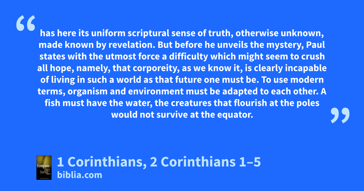 has here its uniform scriptural sense of truth, otherwise unknown, made known by revelation. But before he unveils the mystery, Paul states with the utmost force a difficulty which might seem to crush all hope, namely, that corporeity, as we know it, is clearly incapable of living in such a world as that future one must be. To use modern terms, organism and environment must be adapted to each other. A fish must have the water, the creatures that flourish at the poles would not survive at the equator.