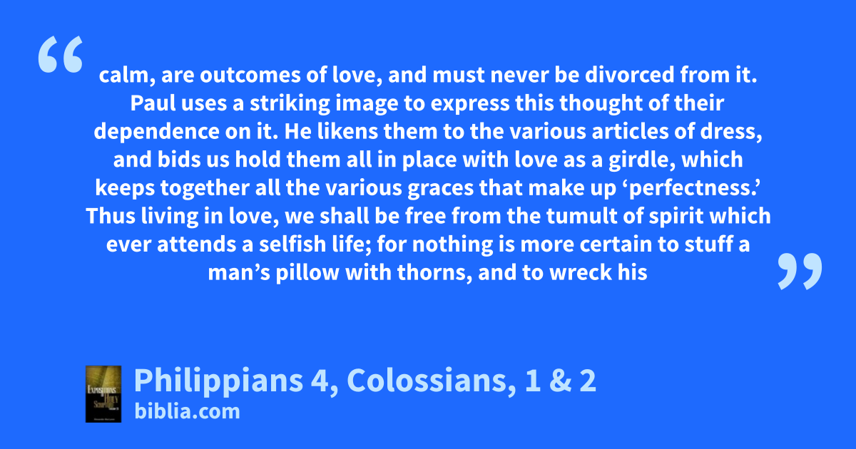 calm, are outcomes of love, and must never be divorced from it. Paul uses a striking image to express this thought of their dependence on it. He likens them to the various articles of dress, and bids us hold them all in place with love as a girdle, which keeps together all the various graces that make up ‘perfectness.’ Thus living in love, we shall be free from the tumult of spirit which ever attends a selfish life; for nothing is more certain to stuff a man’s pillow with thorns, and to wreck his