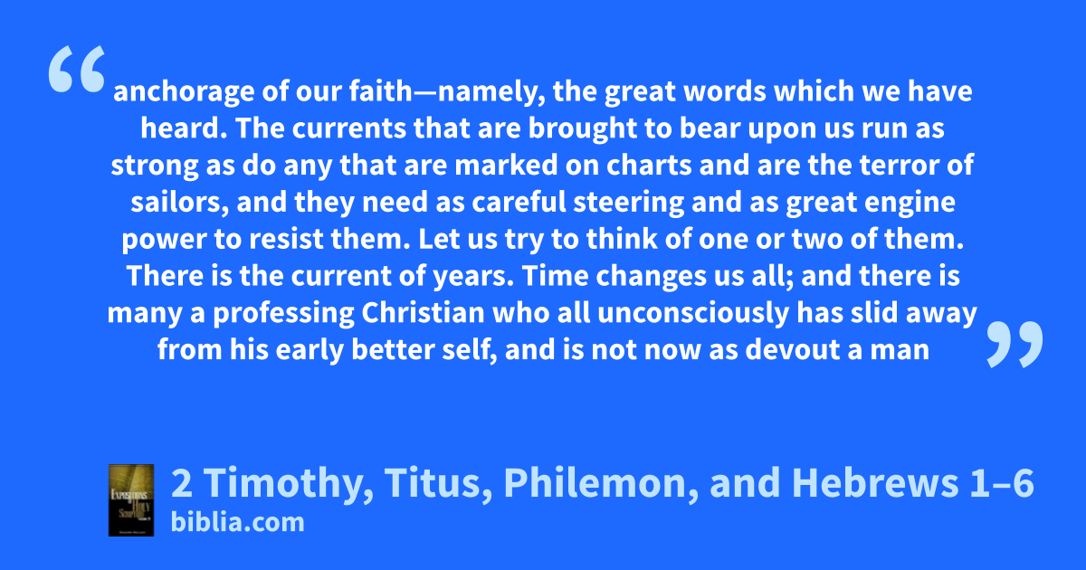 anchorage of our faith—namely, the great words which we have heard. The currents that are brought to bear upon us run as strong as do any that are marked on charts and are the terror of sailors, and they need as careful steering and as great engine power to resist them. Let us try to think of one or two of them. There is the current of years. Time changes us all; and there is many a professing Christian who all unconsciously has slid away from his early better self, and is not now as devout a man