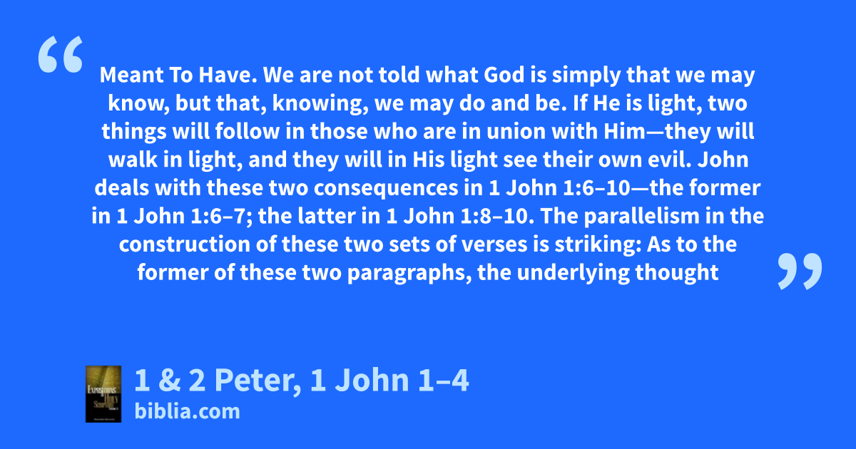 Meant To Have. We are not told what God is simply that we may know, but that, knowing, we may do and be. If He is light, two things will follow in those who are in union with Him—they will walk in light, and they will in His light see their own evil. John deals with these two consequences in 1 John 1:6–10—the former in 1 John 1:6–7; the latter in 1 John 1:8–10. The parallelism in the construction of these two sets of verses is striking: As to the former of these two paragraphs, the underlying thought