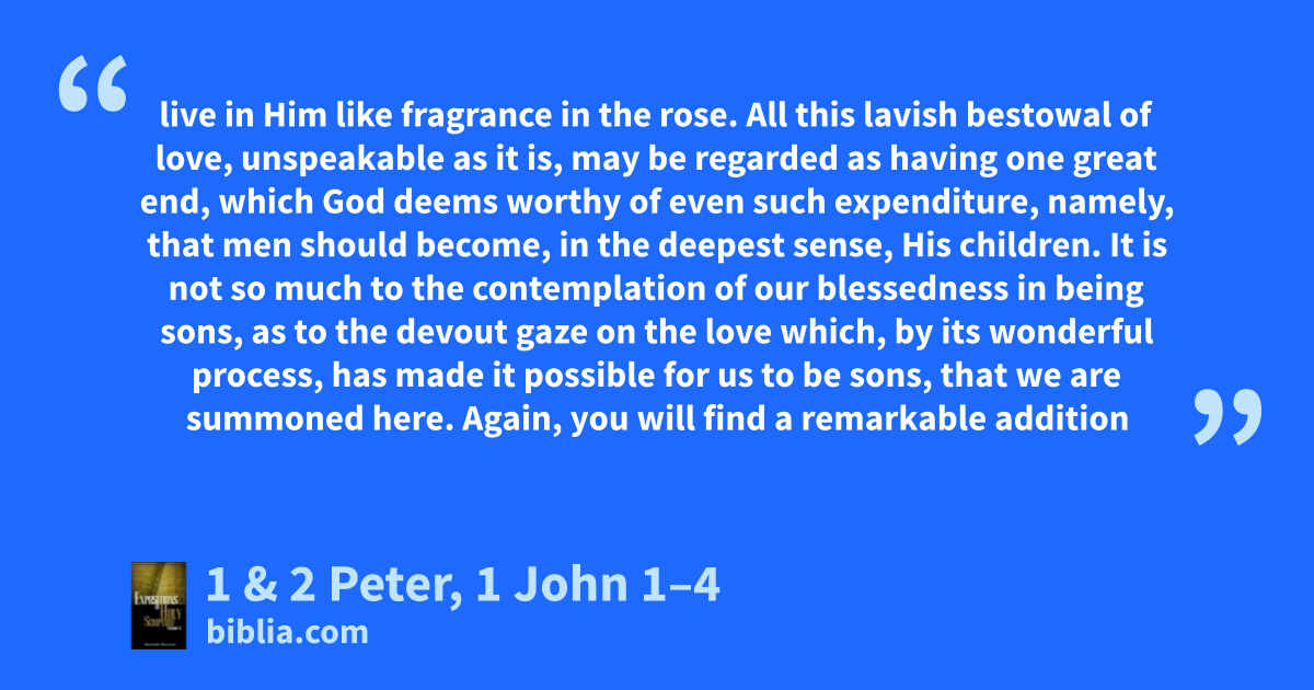 live in Him like fragrance in the rose. All this lavish bestowal of love, unspeakable as it is, may be regarded as having one great end, which God deems worthy of even such expenditure, namely, that men should become, in the deepest sense, His children. It is not so much to the contemplation of our blessedness in being sons, as to the devout gaze on the love which, by its wonderful process, has made it possible for us to be sons, that we are summoned here. Again, you will find a remarkable addition
