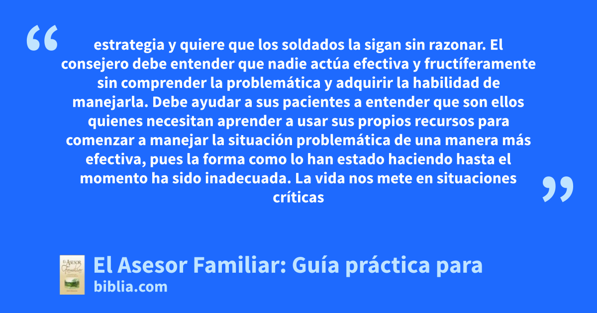 estrategia y quiere que los soldados la sigan sin razonar. El consejero debe entender que nadie actúa efectiva y fructíferamente sin comprender la problemática y adquirir la habilidad de manejarla. Debe ayudar a sus pacientes a entender que son ellos quienes necesitan aprender a usar sus propios recursos para comenzar a manejar la situación problemática de una manera más efectiva, pues la forma como lo han estado haciendo hasta el momento ha sido inadecuada. La vida nos mete en situaciones críticas