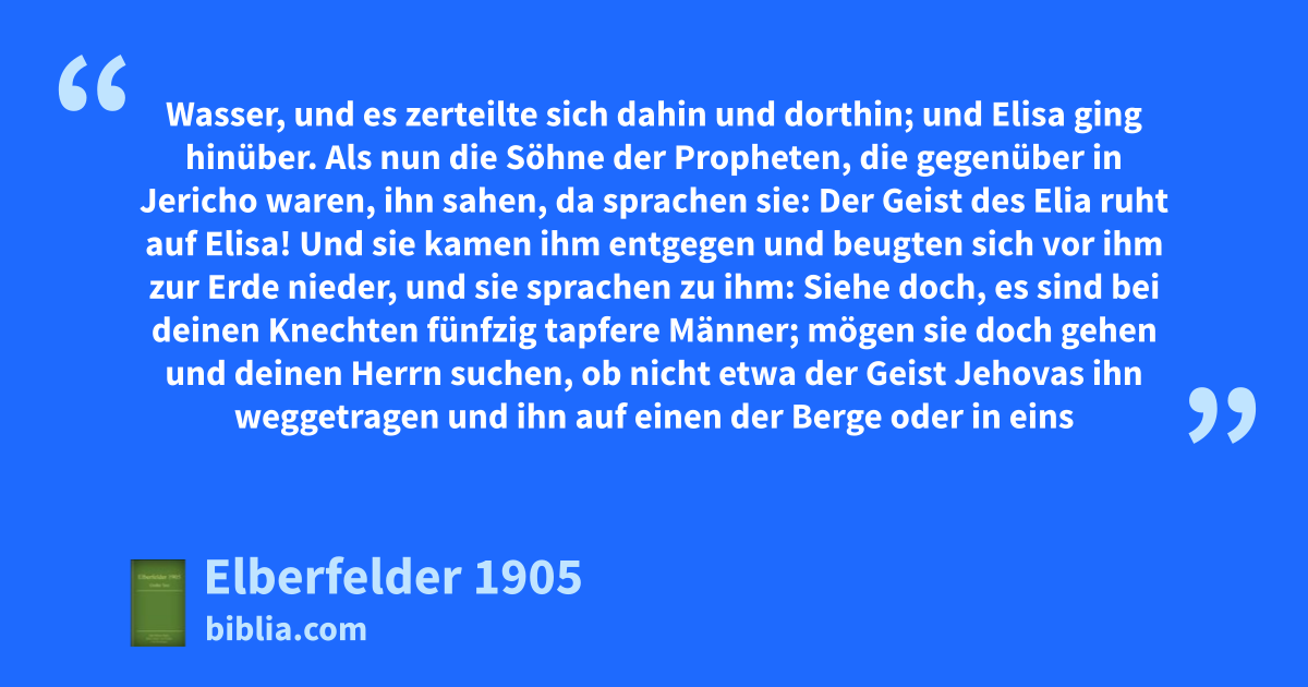 6 Und Elia sprach zu ihm: Bleibe doch hier; denn Jehova hat mich an den Jordan gesandt. Aber er sprach: So wahr Jehova lebt und deine Seele lebt, wenn ich dich verlasse! Und so gingen sie beide miteinander.
