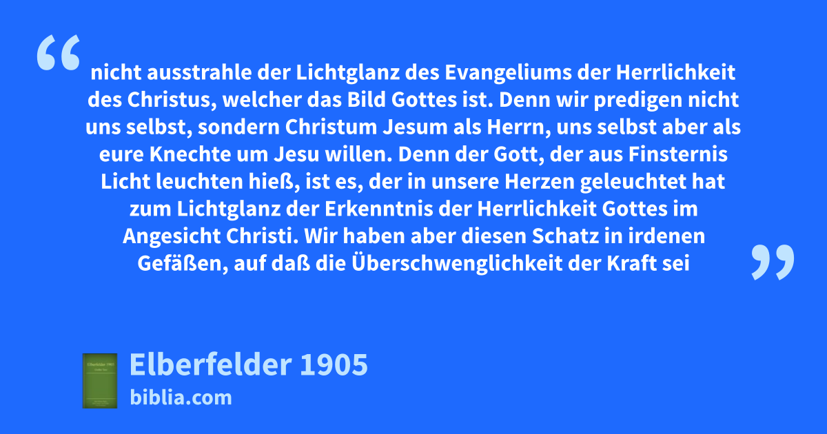 4 in welchen der Gott dieser Welt den Sinn der Ungläubigen verblendet hat, damit ihnen nicht ausstrahle der Lichtglanz des Evangeliums der Herrlichkeit des Christus, welcher das Bild Gottes ist.