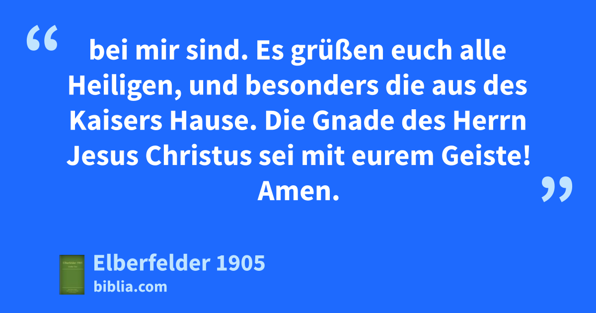 21 Grüßet jeden Heiligen in Christo Jesu. Es grüßen euch die Brüder, die bei mir sind.