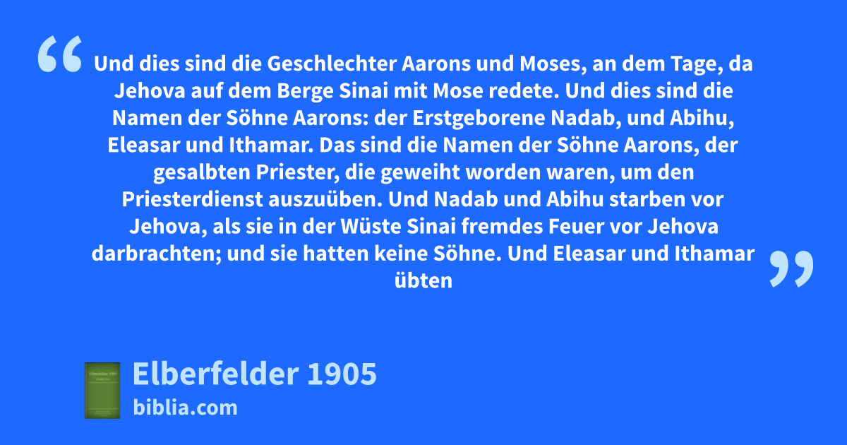 4 Und Nadab und Abihu starben vor Jehova, als sie in der Wüste Sinai fremdes Feuer vor Jehova darbrachten; und sie hatten keine Söhne. Und Eleasar und Ithamar übten den Priesterdienst vor ihrem Vater Aaron aus.