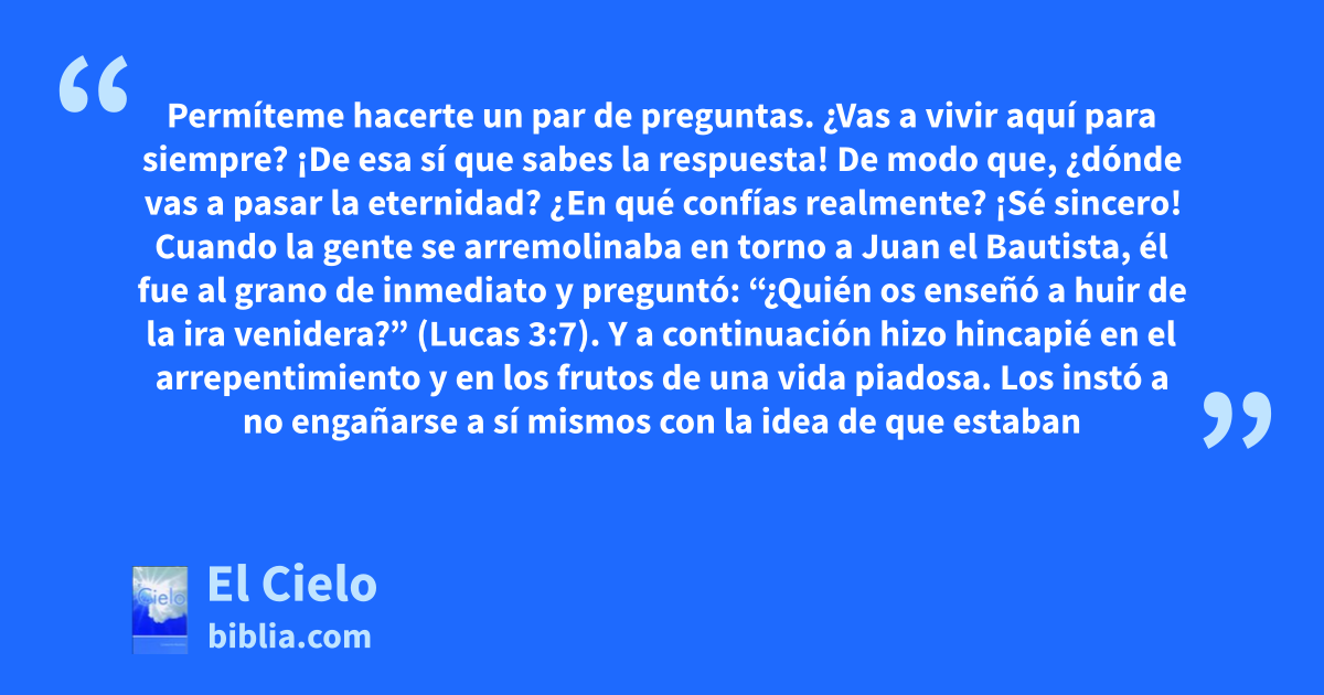 Permíteme hacerte un par de preguntas. ¿Vas a vivir aquí para siempre? ¡De esa sí que sabes la respuesta! De modo que, ¿dónde vas a pasar la eternidad? ¿En qué confías realmente? ¡Sé sincero! Cuando la gente se arremolinaba en torno a Juan el Bautista, él fue al grano de inmediato y preguntó: “¿Quién os enseñó a huir de la ira venidera?” (Lucas 3:7). Y a continuación hizo hincapié en el arrepentimiento y en los frutos de una vida piadosa. Los instó a no engañarse a sí mismos con la idea de que estaban