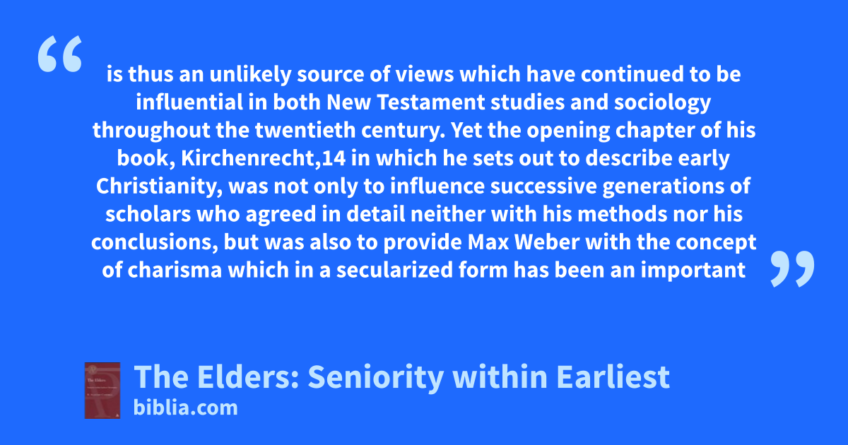 is thus an unlikely source of views which have continued to be influential in both New Testament studies and sociology throughout the twentieth century. Yet the opening chapter of his book, Kirchenrecht,14 in which he sets out to describe early Christianity, was not only to influence successive generations of scholars who agreed in detail neither with his methods nor his conclusions, but was also to provide Max Weber with the concept of charisma which in a secularized form has been an important