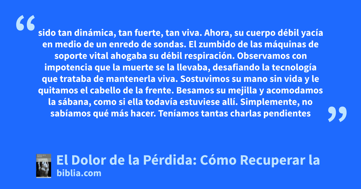 sido tan dinámica, tan fuerte, tan viva. Ahora, su cuerpo débil yacía en medio de un enredo de sondas. El zumbido de las máquinas de soporte vital ahogaba su débil respiración. Observamos con impotencia que la muerte se la llevaba, desafiando la tecnología que trataba de mantenerla viva. Sostuvimos su mano sin vida y le quitamos el cabello de la frente. Besamos su mejilla y acomodamos la sábana, como si ella todavía estuviese allí. Simplemente, no sabíamos qué más hacer. Teníamos tantas charlas pendientes